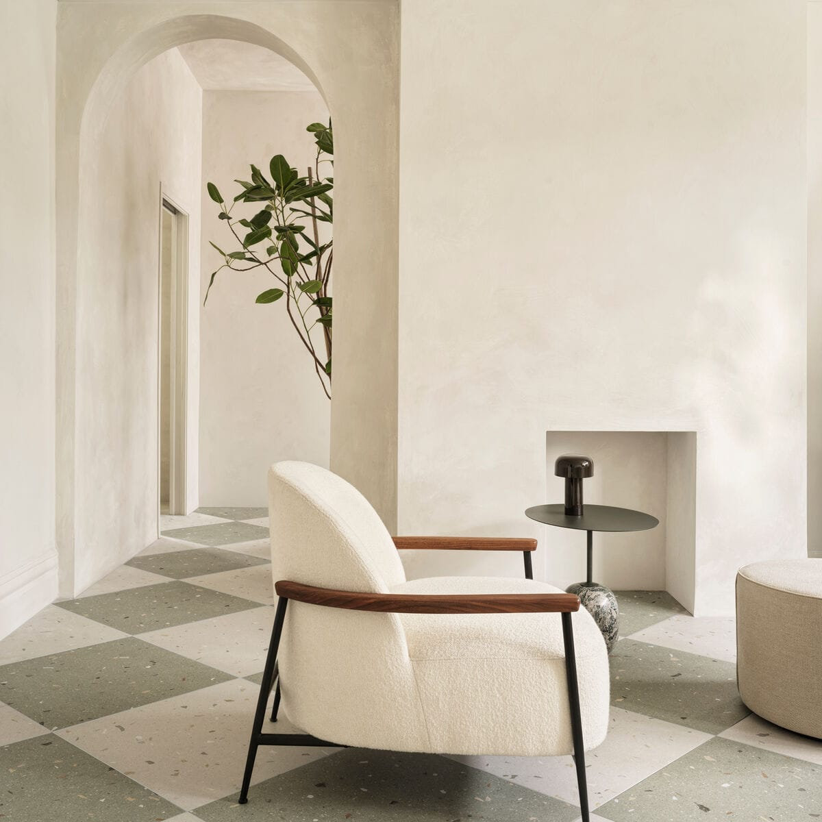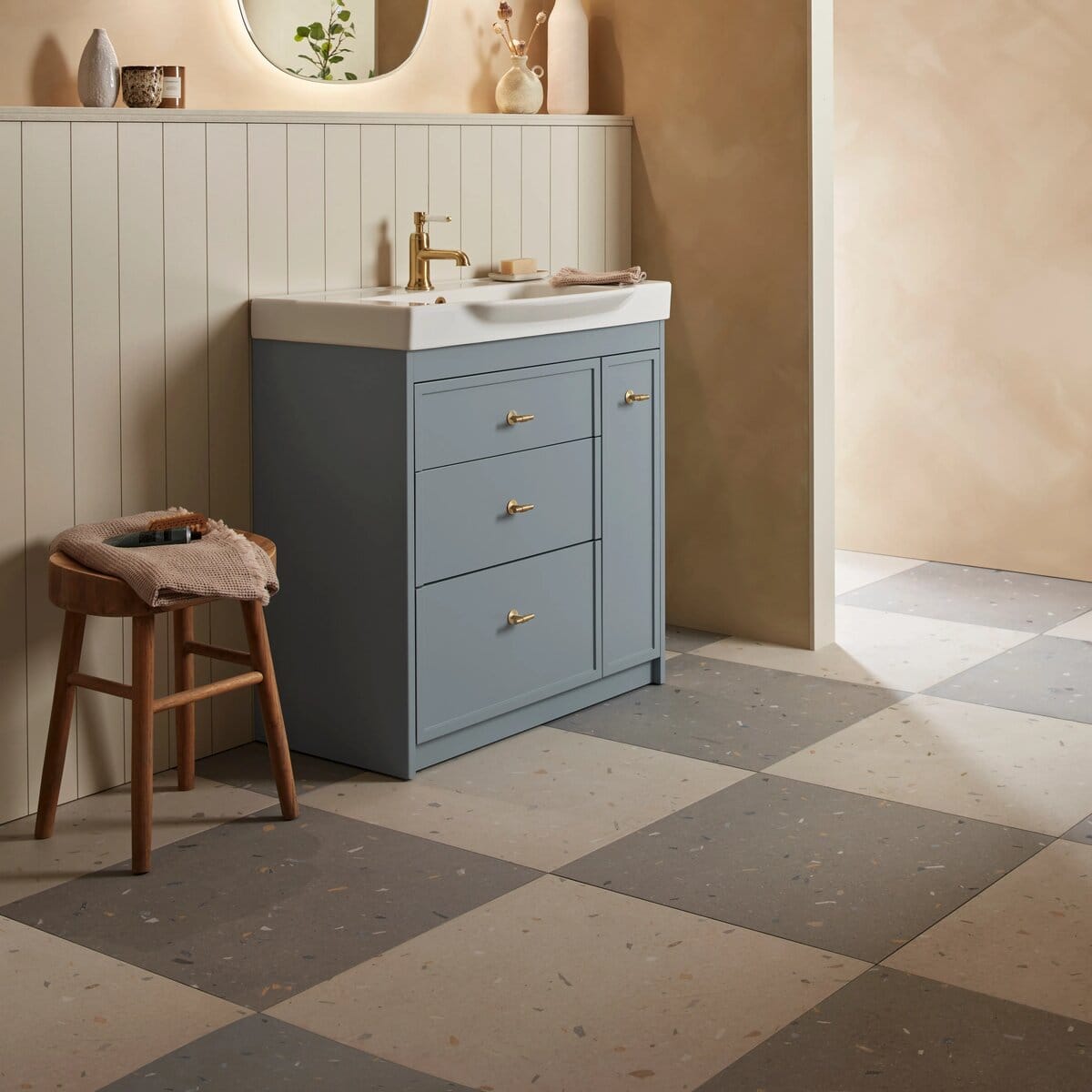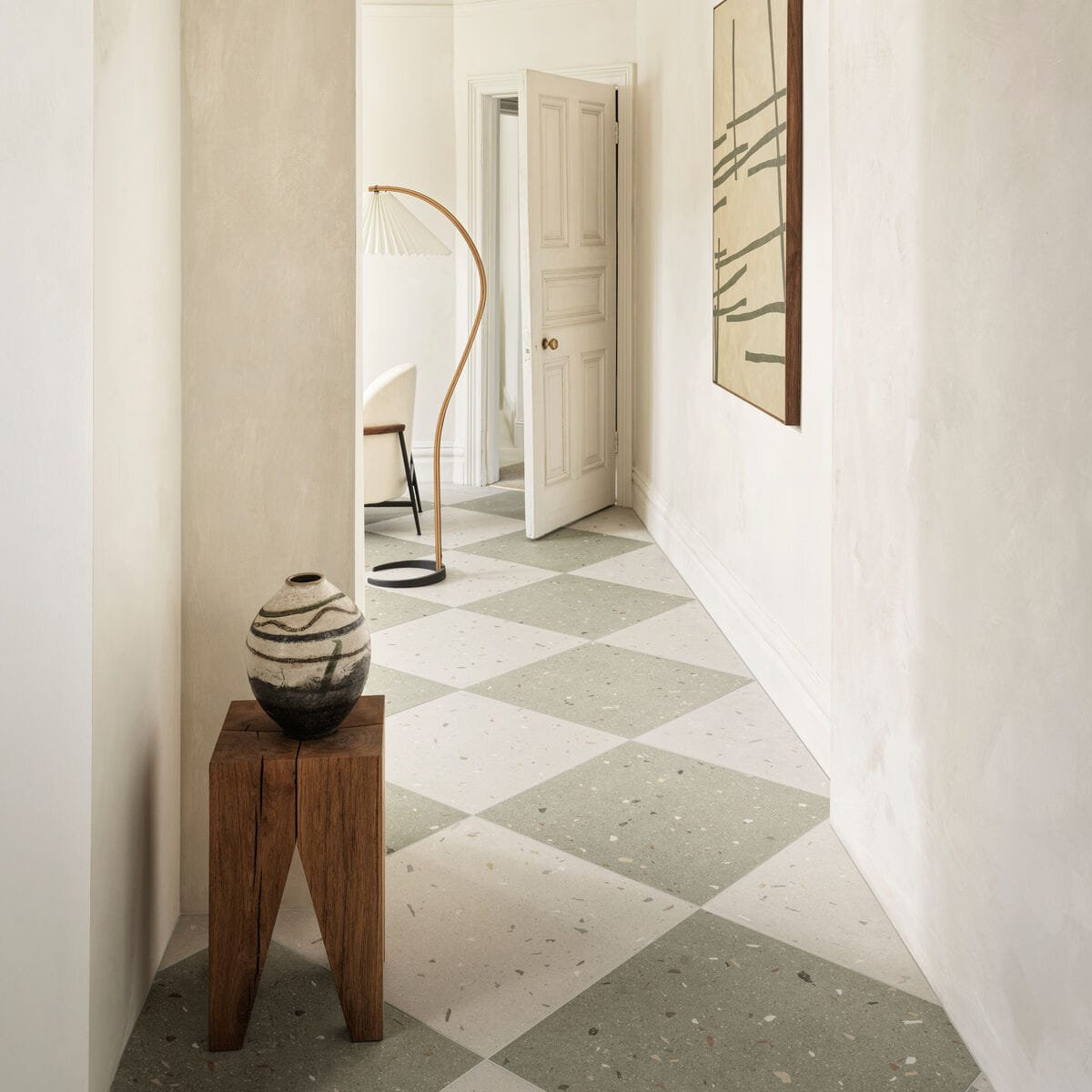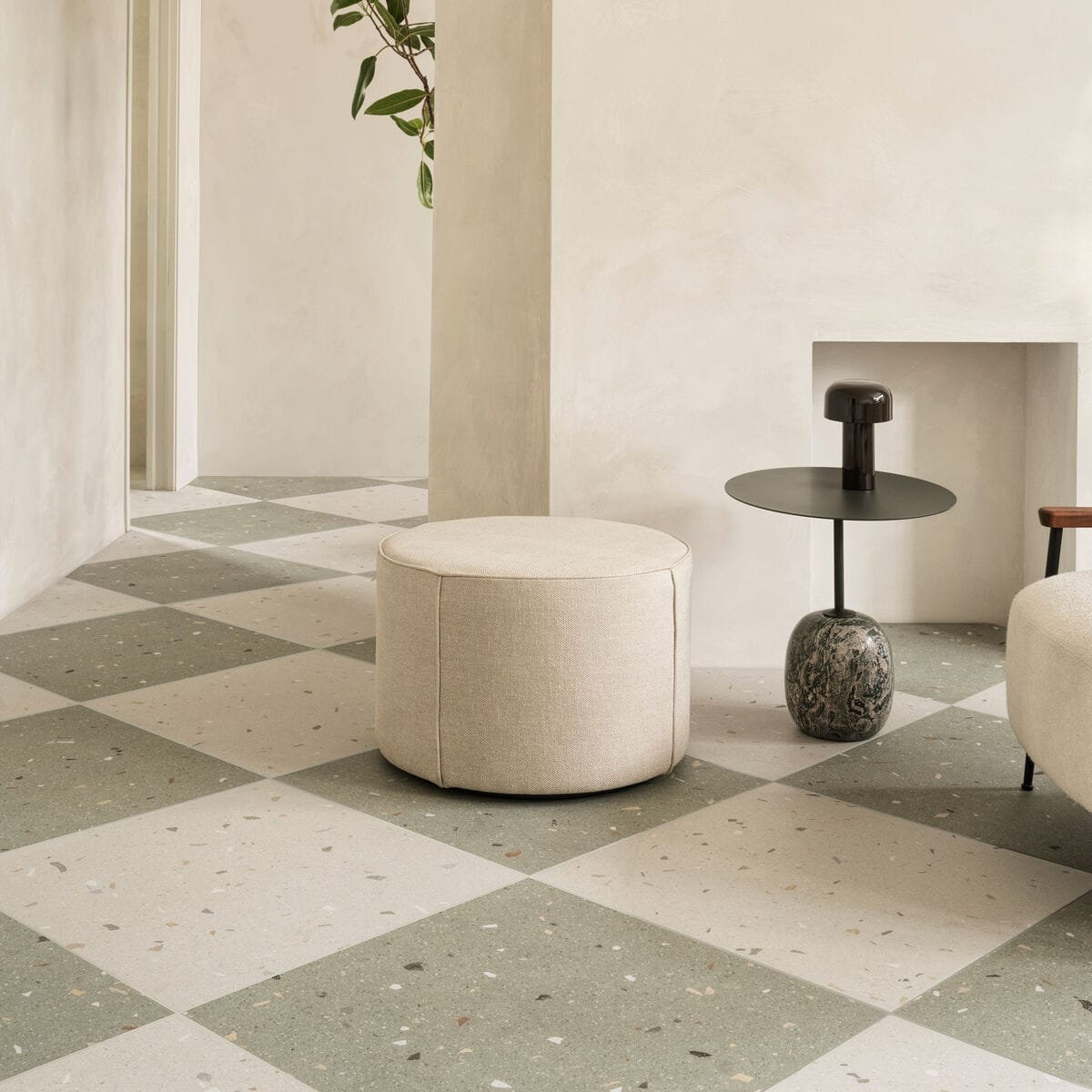 Med sit bløde terrazzo udtryk er denne porcelænsflise både smuk samt hårdfør