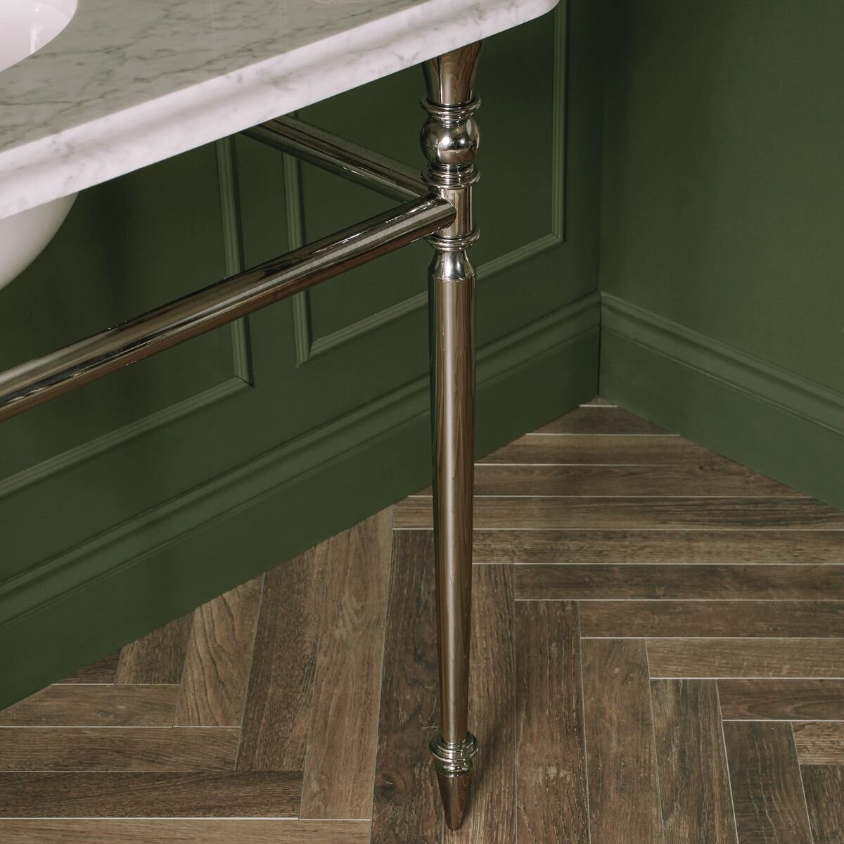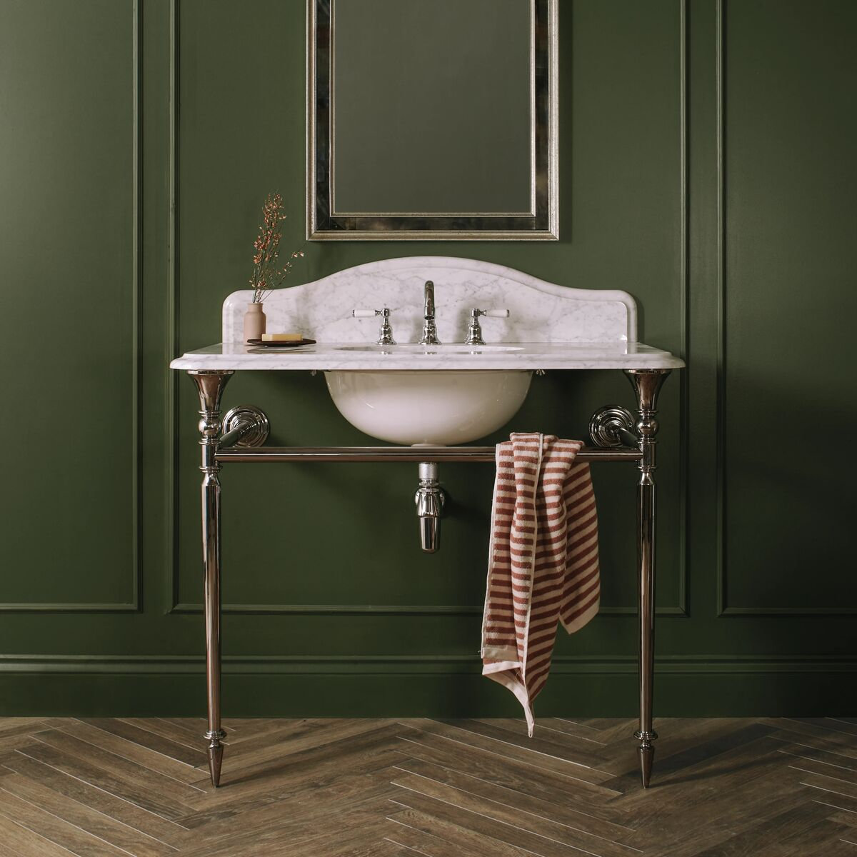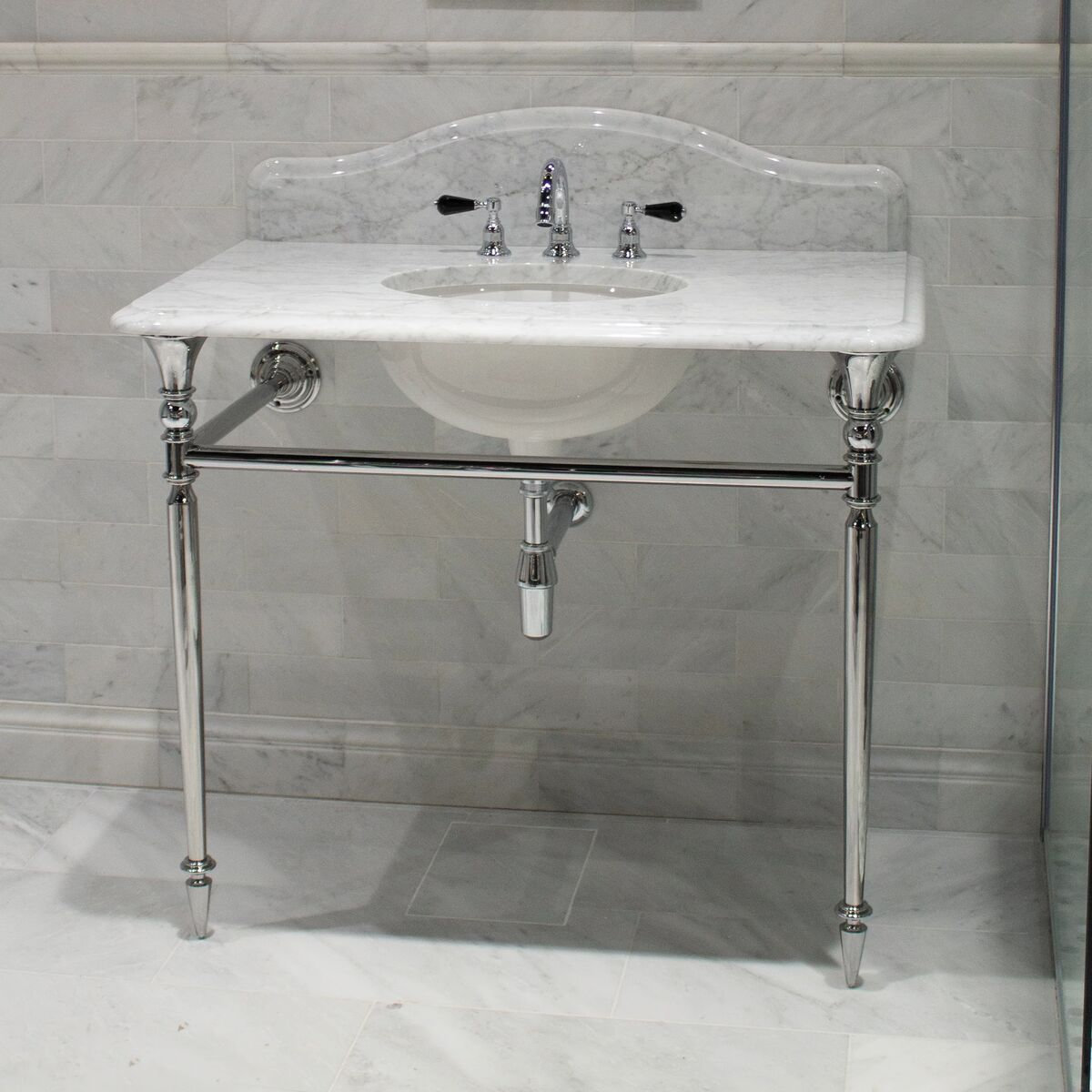 Dorchester er en elegant marmorkonsol med opstandsprofil og underlimet vask, tilgængelig i enkelt- og dobbeltformat. Vaskestativet fås i krom eller nikkel, og du kan vælge mellem fem eksklusive stenbordplader i marmor eller kvarts.