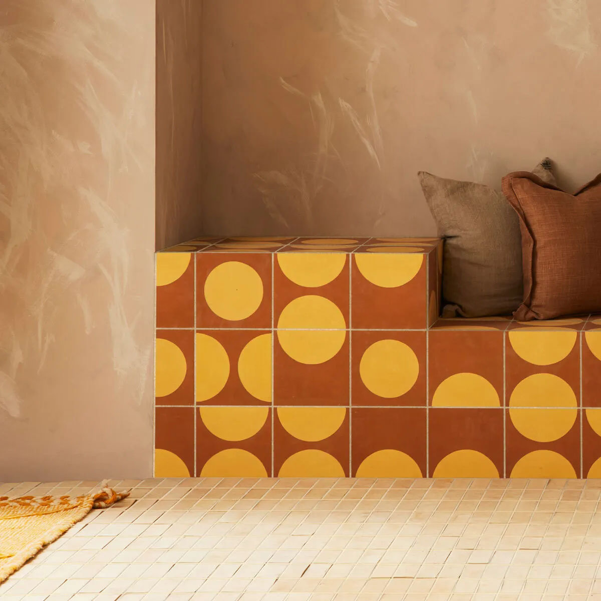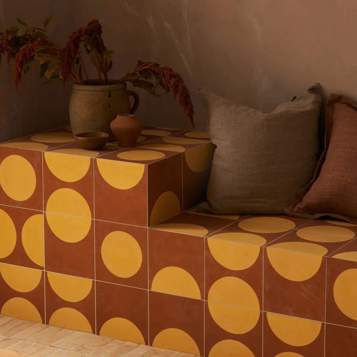 Encaustic er en serie af cementfliser i fire jordnære nuancer inspireret af Middelhavet. Hver flise er håndlavet i Córdoba, Spanien, ved at presse lag af sand, marmorpulver og naturlige pigmenter – en traditionel teknik ført videre gennem generationer.