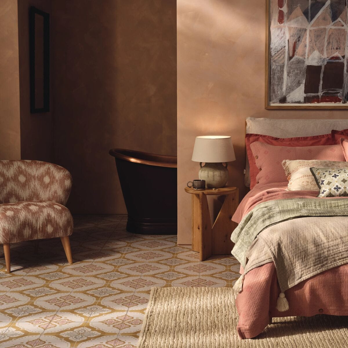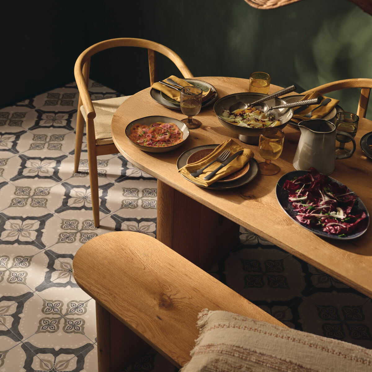 Disse mønstrede fliser er inspireret af den traditionelle indiske bloktryksteknik fra Pink City, Jaipur. De skaber et smukt lagdelt udtryk og tilfører personlighed til hjemmet. Fremstillet i slidstærkt porcelæn er de også velegnede til udendørs brug, hvor de kan give stil og funktionalitet til stier, terrasser og udekøkkener.